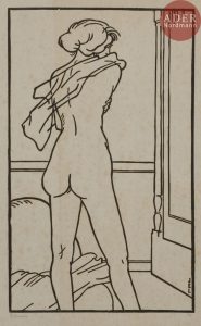 Jean-Émile LABOUREUR - Une puce. 1913. Bois gravé. 247 x 148. Laboureur 689. Très belle épreuve sur japon vergé, signée et numérotée au crayon, puis titrée en pied à gauche. Rousseurs claires éparses. Toutes marges. Tirage à 41 épreuves.