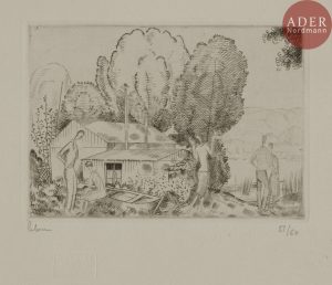 Jean-Émile LABOUREUR - L’Auberge du bord de l’eau (petite pl.). 1925. Burin. 86 x 120. Laboureur 310. Très belle épreuve sur vélin, signée et numérotée au crayon. Fine bande claire d’oxydation en tête. Toutes marges. Tirage à 60...