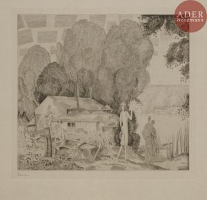 Jean-Émile LABOUREUR - L’Auberge du bord de l’eau (grande pl.). 1925. Burin. 240 x 260. Laboureur 317. Très belle épreuve sur japon, signée au crayon et annotée dans l’angle inférieur gauche « épreuve d’artiste ». Infimes plis de...