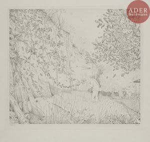Jean-Émile LABOUREUR - L’Entomologiste. 1932-1933. Burin. 372 x 415. Laboureur 475. Très belle et rare épreuve sur vélin, l’une des 3 du 2e état (sur 4), avant les travaux dans la falaise et dans la maison. Quelques rares rousseurs...