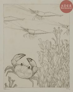 Jean-Émile LABOUREUR - Marine I : les trois poissons ; Marine II : les trois merlans ; Marine III : le bernard-l’ermite ; Marine IV : les crevettes. 1934. Eau-forte et roulette. 195 x 155. Laboureur 498 à 501. Parfaites épreuves sur...