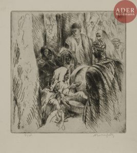 Adolphe BEAUFRÈRE - Les Conteurs d’Alger. 1929. Eau-forte et pointe sèche. 216 x 200. Morane 29-14. Très belle épreuve sur vergé, numérotée et signée au crayon. Toutes marges. Timbre sec : Société des Peintres-Graveurs Français (Lugt...