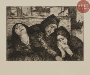 Charles COTTET - Bretonnes sur le quai. 1894. Autographie. 151 x 203. Morane 1. Très belle épreuve sur vélin glacé, du tirage pour la Revue Blanche. Petites marges normales. Joint : Douleur. 1908. Eau-forte. 129 x 179. Morane 53. Très belle...