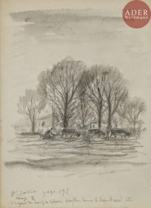 Jean FRÉLAUT - Illustrations pour A. de Chateaubriant, Monsieur des Lourdines, Paris, 1944. Dessins préparatoires. Frélaut 844-892. Mine de plomb, certains avec aquarelle et lavis d’encre de Chine sur vélin mince. Formats divers. Annotés et...