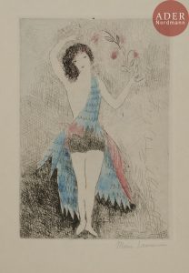 Marie LAURENCIN - Jeune fille à la fleur. 1925. Eau-forte et roulette. 210 x 145. Marchesseau 80. Réunion de 3 parfaites épreuves, la 1re sur vélin mince, du 1er état (sur 4), avant la couleur, non signée, les deux autres de l’état...