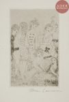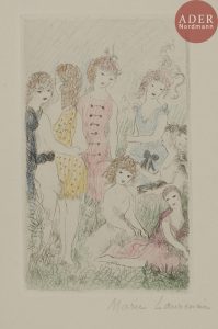 Marie LAURENCIN - Huit filles dans un pré. (Pl. 4 pour J.-R. Bloch, Dix filles dans un pré). Au Sans Pareil éd., 1926. Eau-forte. 129 x 80. Marchesseau 96. Réunion de 5 épreuves sur différents papiers, dont 3 largement reprises aux crayons...
