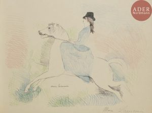 Marie LAURENCIN - Christine ou L’Amazone. 1930. Lithographie. 294 x 414. Marchesseau 153. Impression en couleurs. Parfaite épreuve sur simili-japon, signée au crayon. Toutes marges. Tirage total à 130 épreuves.
