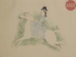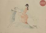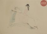 Marie LAURENCIN - Christine ou L’Amazone. 1930. Lithographie. 263 x 323. Marchesseau 153. Réunion de 4 très belles épreuves du 1er état (sur 2), de la pierre-clé tirée en noir, sur japon, largement rehaussées aux crayons de couleurs,...
