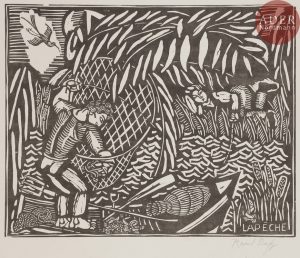 Raoul DUFY - La Pêche. 1910-1911. Bois gravé. 322 x 402. Pernoud, L’Estampe des Fauves, p. 88. Très belle épreuve sur japon, signée au crayon puis numérotée dans l’angle inférieur droit. Rousseurs claires, empoussiérage, traces de...