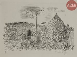 Raoul DUFY - La Batteuse de blé. Vers 1925. Lithographie. 200 x 300. I.F.F. 35. Parfaite épreuve sur chine volant, numérotée et signée au crayon (avec indentation d’une autre signature visible). Toutes marges. Tirage à 100 épreuves.
