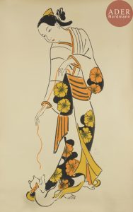 Léonard-Tsuguharu FOUJITA - Geisha jouant avec un chaton. 1926. Lithographie. 1050 x 660. Buisson 26.99. Impression en couleurs. Très belle épreuve sur vélin, numérotée et signée au crayon. Plusieurs traces de plis, certains cassés. Toutes...