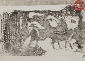 Paul GAUGUIN - Le Char à bœufs – Souvenir de Bretagne. 1898-1899. Gravure sur bois. Feuillet : 210 x 288. Guérin 70 ; Mongan, Kornfeld et Joachim 51. Très belle épreuve sur japon pelure, ni signée ni numérotée. Double fin pli vertical de...