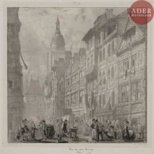 Richard Parkes BONINGTON - Rue du Gros Horloge, Rouen. 1824. Lithographie. 245 x 250. Curtis 16. Très belle épreuve sur chine appliqué. Fortes rousseurs essentiellement sur le support. Toutes marges. Joint : Tour du Gros Horloge, Évreux. 1824....