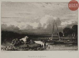 Jules DUPRÉ - Vue prise en Angleterre. 1836. Lithographie. 129 x 205. Delteil 5. Très belle épreuve sur chine appliqué, du tirage de Bertauts. Nombreuses rousseurs claires sur le support. Toutes marges.