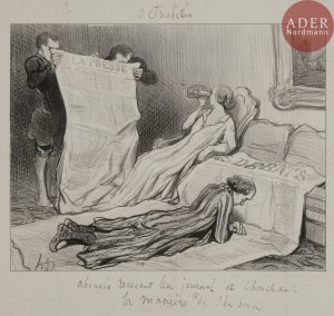 Honoré DAUMIER - Abonnés recevant leur journal et cherchant la manière de s’en servir. (Actualités, pl. 115). 1845. Lithographie. 230 x 245. Delteil 1335. Très belle épreuve sur blanc. Quelques rousseurs claires et menues salissures....