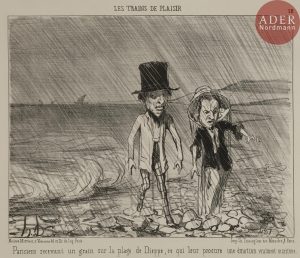 marges. Joint : Les Trains de plaisir, pl. 6. 1852. Lithographie. 225 x 260. Delteil 2330. Belle épreuve sur vélin mince, oxydée, revêtue du certificat de tirage à la plume et à l’encre sépia, signé et daté par Trinocq. Petit manque dans l’angle inférieur gauche. Toutes marges. Timbre de douane au verso. Ens. 8 p.