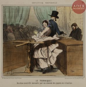Honoré DAUMIER - L’Exposition universelle, pl. 9, 13, 15, 21, 27, 29, 30 et 35. 1855. Lithographie. Chaque env. [270 x 360]. Delteil 2672, 2676, 2678, 2684, 2690, 2692, 2693, 2702. Belles épreuves sur blanc, D. 2678 en coloris gommé du temps....