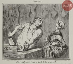 Honoré DAUMIER - Messieurs les bouchers. 1858 ; Actualités. 1858. Lithographie. Chaque env. [255-280 x 340-360]. Delteil 3010 à 3021. Très belles épreuves sur blanc. Quelques rousseurs. Courte déchirure en pied à D. 3018. Belles ou bonnes...