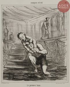 Honoré DAUMIER - Croquis d’été, pl. 3, 4, 8, 13, 16. 1865. Lithographie. [360 x 275]. Delteil 3449, 3450, 3451, 3452, 3454, 3455. Très belles épreuves sur blanc. Rousseurs claires à certaines pl. Petits manques et menus accidents dans...