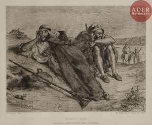 Eugène DELACROIX - Arabes d’Oran. 1833. Eau-forte et roulette. 174 x 214. Delteil, Strauber 20. Superbe épreuve tirée avec teinte de fond sur vergé fort filigrané « Aqua fortistes », du 4e état (sur 6), avec le numéro « 197 » et...
