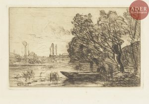 Jean-Baptiste-Camille COROT - Ville d’Avray (le bateau sous les saules, effet de matin). 1857. Eau-forte. 77 x 125. Delteil 2. Très belle, brillante et rare épreuve sur vergé mince. Traces de plis en pied du feuillet et pli oblique en...