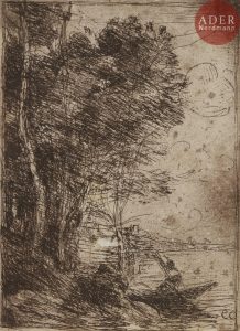 Jean-Baptiste-Camille COROT - Souvenir de Fampoux. 1854. Cliché-verre. 90 x 65. Delteil 40. Belle épreuve d’ancien tirage en brun. Petit arrachement dans le sujet. Petites rousseurs claires éparses. (Ce sujet ne figure pas dans les retirages...