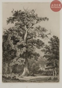 Eugène BLÉRY - Le Vieux chêne au Bois de Boulogne. 1856. Eau-forte. 450 x 320. Beraldi 102. Très belle épreuve sur chine appliqué, annotée « Epreuve unique du 2eme Etat » et signée au crayon. Nombreuses rousseurs claires sur le...