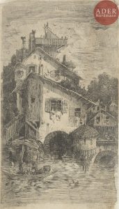 Rodolphe BRESDIN - Moulin à eau. 1866. Eau-forte. 165 x 90. Van Gelder 119. Intéressante épreuve sur bulle grisâtre appliqué (ce dernier avec petits manques aux bords préalables à l’impression), du 1er état (sur 2), avant reprise du...