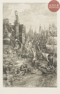 Rodolphe BRESDIN - Mon rêve (version II). 1883. Eau-forte. 184 x 119. Van Gelder 150. Très belle épreuve sur chine appliqué, l’une des premières épreuves d’essai du 2e état selon Van Gelder (soit 2e état sur 3), avant la lettre,...