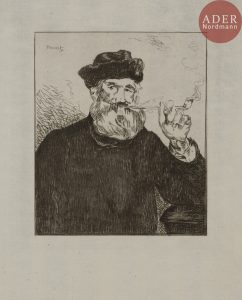 Édouard MANET - Le Fumeur (2e pl.). 1866. Eau-forte. 172 x 155. Guérin 49 ; Bareau-Berès 55 ; Fisher 40. Très belle épreuve sur vergé ancien mince, le cuivre réduit, du tirage à 100 épreuves effectué pour Strölin en 1905, le bord...