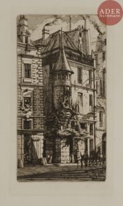 Charles MERYON - Tourelle rue de la Tixéranderie. 1852. Eau-forte. 247 x 132. Delteil 29 ; Schneiderman 24. Très belle épreuve sur vergé, du 3e état (sur 4), avant la lettre. Fine trace claire d’insolation à l’ouverture d’un ancien...