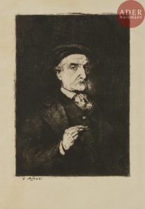 Théodule RIBOT - Portrait d’Émile Cardon. Eau-forte. 278 x 195. Très belle et rare épreuve sur vergé, avant lettre, annotée à la plume et à l’encre sépia « 3ième état 6ième épreuve » et signée, puis dédicacée « à...