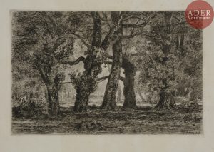 Jules MICHELIN - Paysages. 1866-1868. Eau-forte. Formats divers. Bonnes épreuves (un sujet, La Bourboule, 1866, en double), 3 montées sous passe-partout portant les marques de F. Masson (Lugt 1031) et L. Valentin (Lugt 2498). Rousseurs claires....
