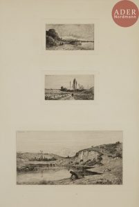 feuillets portant trois sujets superposés, les deux premiers dans un ordre inversé sur le 2e, respectivement du 2e état (sur 4), avant la lettre, et du 3e état avec la lettre, du tirage pour l’Album de la Société des Aqua-fortistes. Fine bande d’oxydation en pied au 1er feuillet. Toutes marges. Timbre sec : Cadart et Luquet (Lugt 424) au 2e. Ens. 2 p.