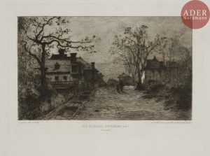 Adolphe APPIAN - Rue du village d’Artemare (Ain). 1871. Eau-forte. 158 x 238. Curtis et Prouté 33. Très belle épreuve tirée à l’effet sur vergé blanc, du tirage pour L’Illustration Nouvelle. Rousseurs claires aux bords du feuillet....