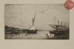 Adolphe APPIAN - Canal aux Martigues. 1875. Eau-forte. 157 x 237. Curtis et Prouté 41. Très belle épreuve sur vergé crème, du 1er état (sur 4), avant la lettre. Pli vertical médian perceptible dans la marge inférieure et pli oblique dans...