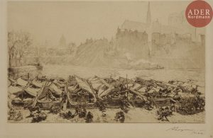Auguste LEPÈRE - Le Grand marché aux pommes. 1891. Eau-forte. 313 x 466. Lotz-Brissonneau 35. Très belle épreuve sur vergé fort, légèrement oxydée, du 2e état (sur 3), rognée sur le coup de planche sur trois côtés, signée à la plume...