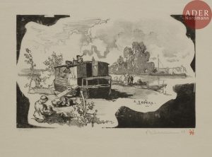 Auguste LEPÈRE - Bateau-logement du passeur à Billancourt ; Paris tragique : un bras de la Seine ; Marché aux pommes ; Place Gerson et rue Restot (pl. pour L’Image et La Revue Illustrée). 1886-1888. Lotz-Brissonneau p. 267-269. Gravure...