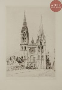 Gustave LEHEUTRE - Notre-Dame de Chartres. 1913. Eau-forte et pointe sèche. 417 x 285. Delteil 112. Très belle et fraîche épreuve sur vergé, annotée « dernier état », signée et numérotée au crayon, puis titrée en pied. Toutes...