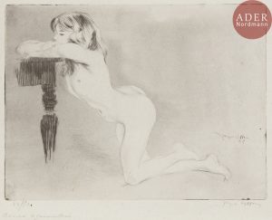 Jacques VILLON - Fillette agenouillée. 1908. Eau-forte et pointe sèche. 148 x 198. Ginestet et Pouillon 230. Très belle épreuve sur vergé mince, numérotée et signée au crayon. Petites traces d’encre marginales. Petites marges normales....