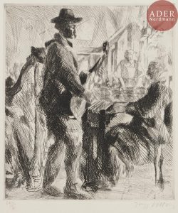 Jacques VILLON - Musiciens chez le bistrot. 1912. Eau-forte. 266 x 232. Ginestet et Pouillon 270. Très belle épreuve sur vergé, numérotée et signée au crayon. Une petite rousseur claire sous le numéro. Toutes marges. Tirage à 50 épreuves.