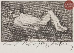 Jacques VILLON - Petit nu étendu. 1930. Eau-forte. 54 x 97. Ginestet et Pouillon 335. Très belle épreuve sur vélin fort, du tirage en carte de vœux avec l’inscription gravée « Noël 1933 », annotée à la plume et à l’encre « Pour...