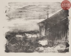 Maurice de VLAMINCK - Environs de Triel. 1923. Lithographie. 464 x 575. Walterskirchen 166. Très belle épreuve sur vélin fort filigrané « Arches », numérotée et signée au crayon. Trace huileuse circulaire au bord droit du sujet. Courte...