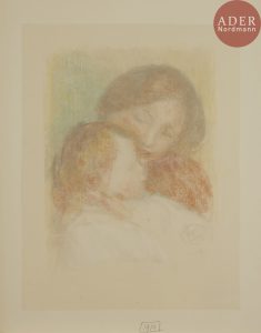 Infime trace d’oxydation aux bords du feuillet. Salissures et décharges de pastel au verso. - - La 1re épreuve de ce sujet transféré à partir du pastel original figure dans le catalogue Renoir, The Pastel Counterproofs (op. cit.), n° 27. Notre épreuve conserve des couleurs très fraîches et une définition bien marquée des contours. Le même sujet a fait l’objet d’une lithographie, Maternité (grande pl.), vers 1912 (Delteil 50). Il se retrouve aussi dans Une mère et deux enfants (lithographie, Delteil 54). Le pastel original d’où est tirée cette contre-épreuve figure dans le catalogue établi par Vollard en 1918 sous le numéro 1207.