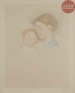 Mary CASSATT - Child Leaning against her Young Mother. Vers 1913. Contre-épreuve (2e épreuve) de pastel sur japon pelure (550 x 760) appliqué sur vélin [660 x 840]. Signature à l’envers en bistre dans la partie inférieure du sujet....