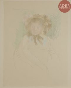 Mary CASSATT - Sara in a Dark Bonnet Tied under Her Chin. Vers 1901. Contre-épreuve de pastel sur japon pelure (532 x 695) appliqué sur vélin [650 x 745]. Signature à l’envers en bleu au-dessus du sujet à gauche. Infimes salissures...