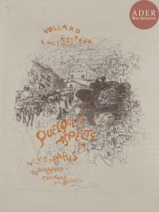 Pierre BONNARD - Couverture pour Quelques Aspects de la Vie de PAris. 1899. Lithographie. 410 x 330. Bouvet 58 ; Johnson 10. Impression en couleurs. Bonne épreuve sur chine volant. Fortes ondulations survenues au tirage aux bords du feuillet et...