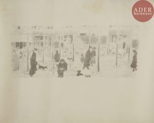 Pierre BONNARD - Boulevard. 1899. Lithographie. 174 x 432. Bouvet 63 ; Johnson 10-5. Belle épreuve d’essai sur vélin blanc mince de la pierre-clé tirée en noir. Auréoles claires d’humidité en tête. Bande d’empoussiérage au bord...