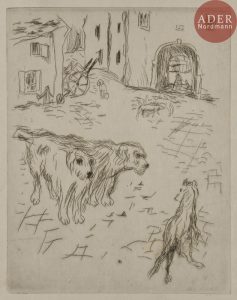 Pierre BONNARD - Pl. pour Dingo d’Octave Mirbeau. Paris, A. Vollard éd., 1924. Eau-forte. [435 x 332]. Bouvet 90 ; Johnson 169. Suite des 14 pl. hors-texte. Très belles épreuves sur japon vergé mince. Quelques rousseurs claires, plis et...