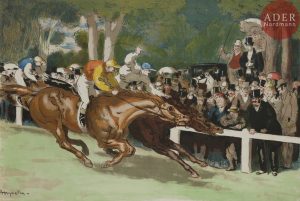 Louis ANQUETIN - Un Canter. 1898. Lithographie. 346 x 509. I.F.F. [5]. Impression en couleurs. Très belle et fraîche épreuve sur chine volant, timbrée par l’éditeur G. Pellet (Lugt 1190, timbre passé), numérotée au crayon. Larges...